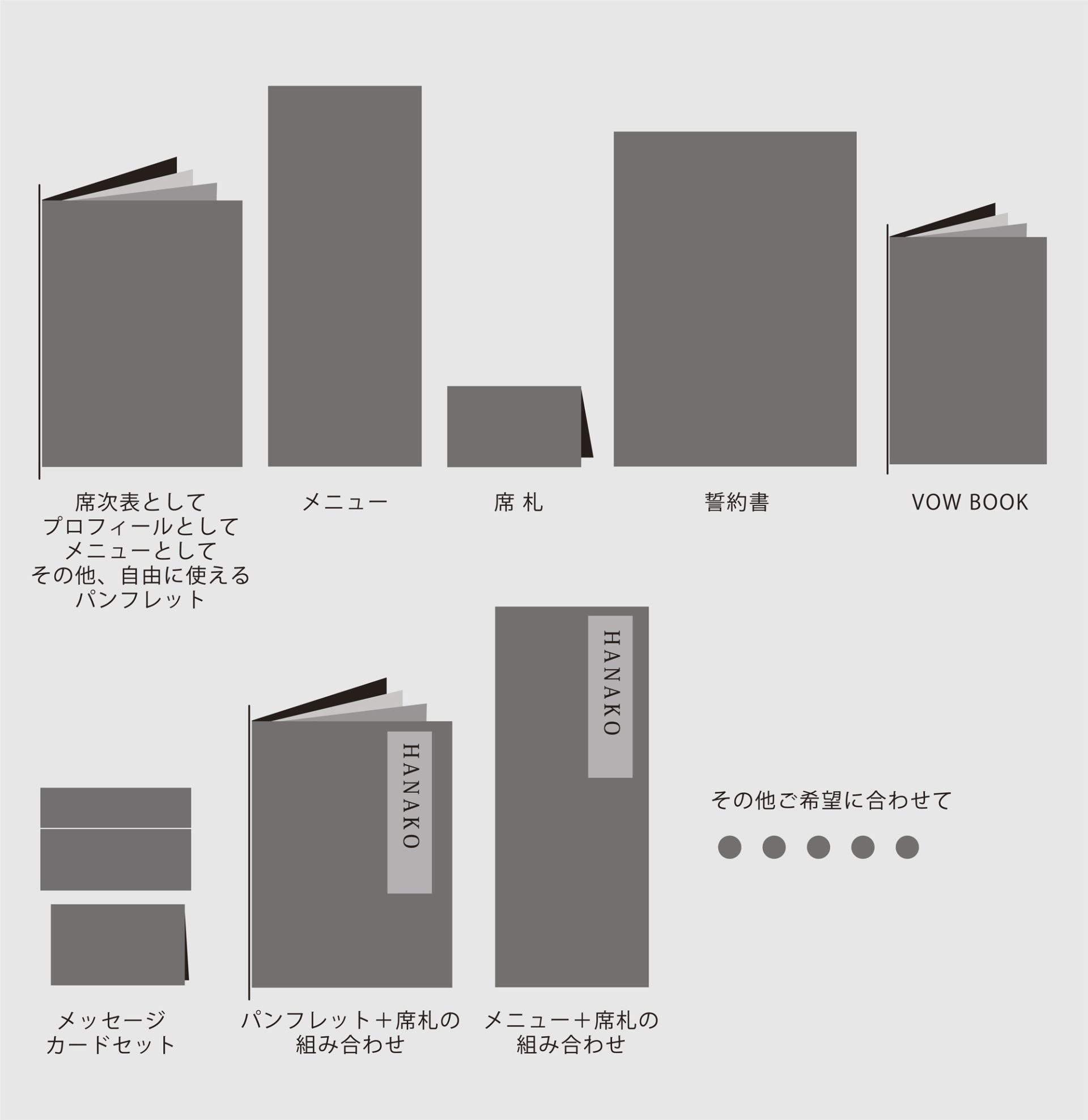 メニューのみ制作される場合やプロフィールのみの制作。そのプロフィールも大きさや紙質やページ数など様々ですし、それらと席札ネームカード等を組みあわせて制作することもあるでしょう。