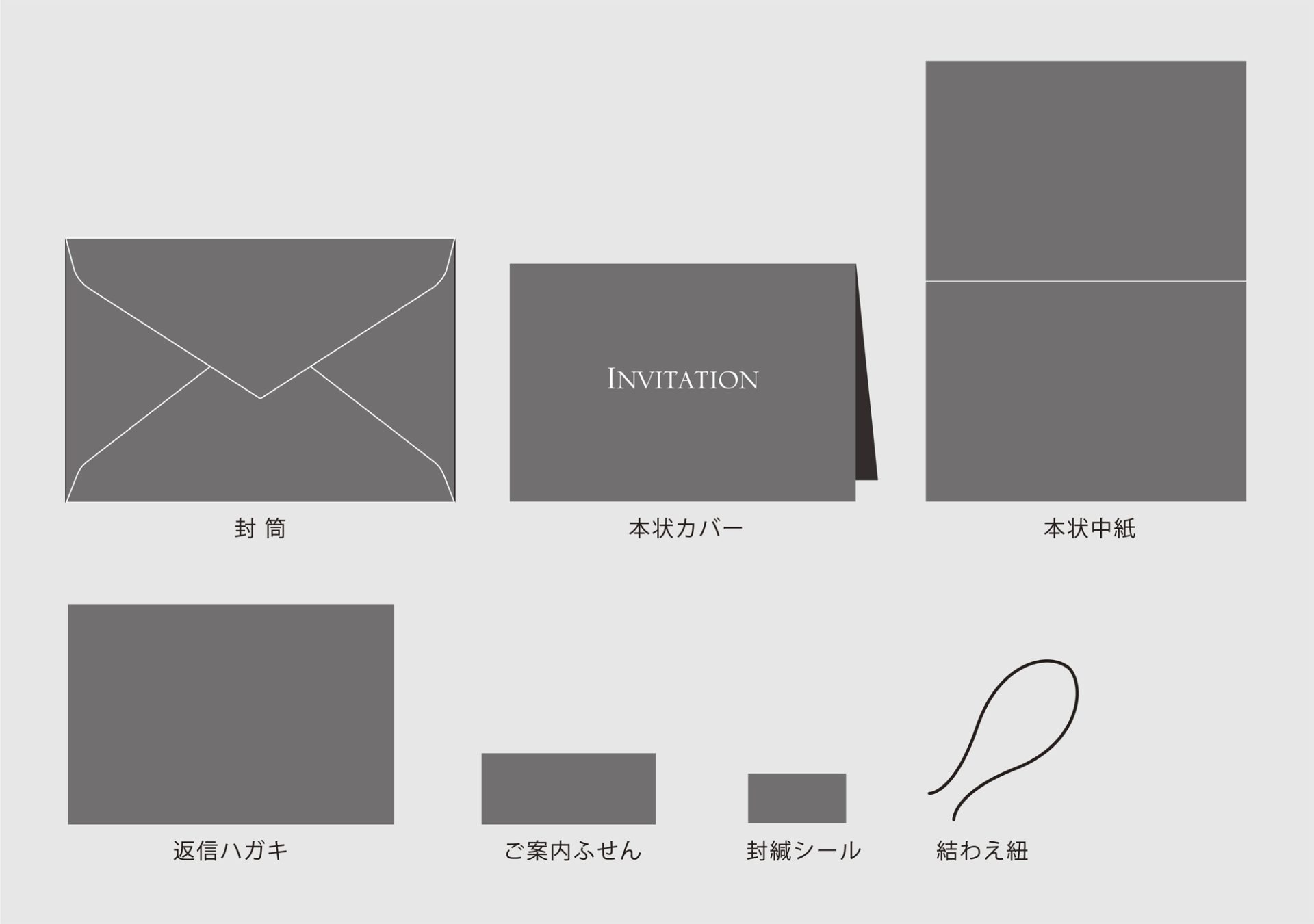 セット一式の内容は、上の図のようになります。詳しくは以下のリンク(招待状カスタムコレクションのセット内容)にてご確認ください。